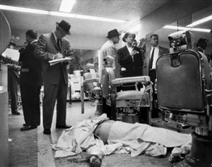 Dick Dedrick’s excellent audio documentary Private Eyes: Chandler & Marlowe ends with a recording of Raymond Chandler’s July 1958 interview with Ian Fleming. At this late stage of his life, Chandler was widowed, depressed and drunk, but consented to the interview out of his respect for Fleming who held him in equally high regard. It is a sometimes difficult interview to listen to, with Chandler slurring his words and Fleming struggling to keep him focused. However, there are several moments when he shines, such as when Fleming asks Chandler about the recent murder in New York of Albert Anastasia, Boss of the Gambino Crime Family. Anastasia was sitting in the barber chair in the barber shop of the Park Sheraton Hotel when two men rushed in and shot him to death. The motive, it is believed, was an internal power struggle and tensions with the other New York Crime Families. The case was never solved. The photo of Anastasia dead on the barber shop floor became one of the most iconic images in Mafia history.
