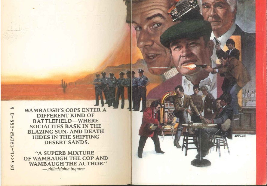 The Secrets of Harry Bright was a return to fiction for Wambaugh and is a wonderfully absurdist mixture of black comedy, tragedy and mystery set in the fictional Mineral Springs, California. I’ve written a full-length review of the novel here. This cover image is wonderfully minimalist. I like the way the reds and oranges convey the blinding, oppressive heat of the Sonoran desert. Unlike Lines and Shadows, in which the inside pages extend the cover art, for The Secrets of Harry Bright, the style is completely different. We’re back to the action-packed images, which is odd, as it is not a novel that relies on much action. The car explosion, if I remember correctly, belongs to the back-story. The inside cover art seems to reassure the reader that you’re still in a Wambaugh story, even if the promises of action made by the artist aren’t delivered in the story.