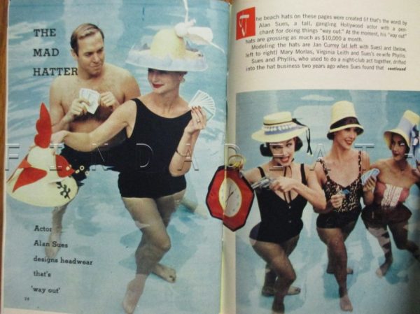 Sues was forced to close the Gazebo which was getting too expensive to maintain, but continued to make hats at home for his wholesale buyers. The business peaked in June, 1959 when ‘TV Guide printed a three-page colour pictorial featuring Alan and several females modelling his hats’