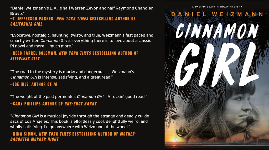 Weizmann: I’ve been very blessed to have an incredible agent, Janet Oshiro, and an editor, Carl Bromley, who’s English, and I don’t think it’s an accident that he’s English. I’ll come out and say that he comes to noir with a rich sensibility. In Cinnamon Girl I’m trying to rail against the genres lean towards nostalgia. Not because I don’t get it. Quite the opposite. I’m intensely nostalgic to the point that I think it’s dangerous. So that’s what I tried to deal with in the book.